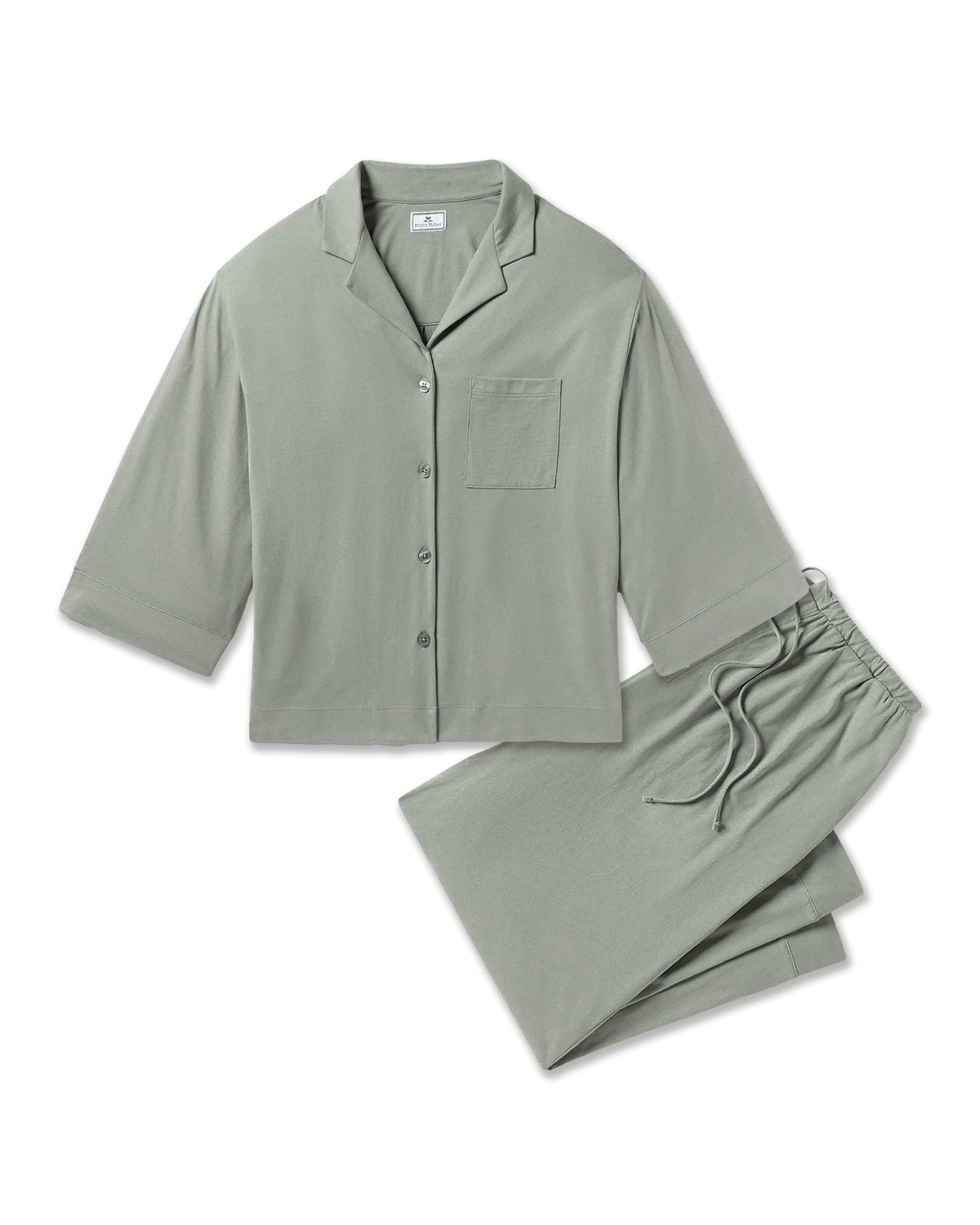 Petite Plume wishes you a “bonne nuit,” and in their luxury sleepwear, it’s hard not to oblige. The Olivia Wide Leg Pima Pajama Set in Sage introduces a calming new shade to your nighttime ritual. Tailored with feminine ease, this design features three-quarter length sleeves and a more generous pant leg that creates a refined swish-swish as you walk, combining comfort with elegance. Crafted from buttery soft Pima cotton in a serene green, it’s destined to become a sleepwear staple.