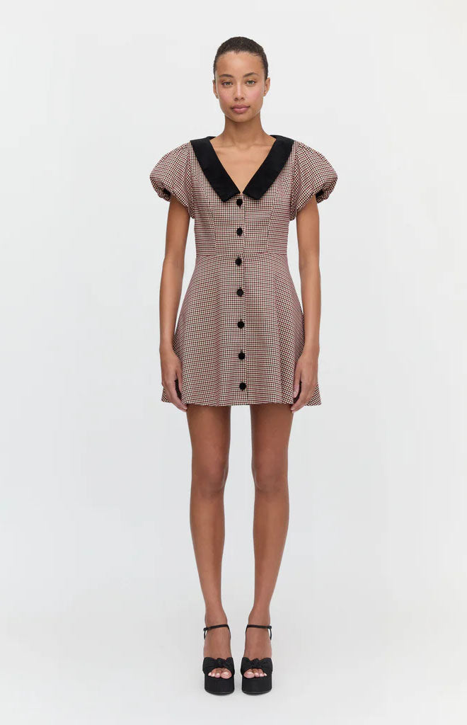 Hill House Home is a fashion and lifestyle brand that brings beauty and joy to everyday rituals. With a design-centric approach, Hill House offers impeccable quality, and timeless, delicate styles through quality products designed to enhance and celebrate life. The Samantha Dress in Burgundy Holmes Houndstooth is a chic mini dress with a tailored feel, featuring puffed sleeves, a v-neckline with a velvet lapel, and functional velvet buttons for a refined finish.