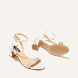 Margaux makes wear-anywhere, and everywhere, shoes that keep you comfortable no matter where they day takes you. The New York shoe brand is all about size inclusivity and offers three widths, from sizes 3 to 14, as well as virtual fit sessions, to help you find that marriage of comfort and style every step of the way. Crafted with a luxurious satin upper, lined in leather, The Stella Sandal in Ivory Satin with Crystals boasts a placed strap for a comfy fit and minimal coverage, and a walkable, 2.5 inch block heel. At once, super elegant and chic.