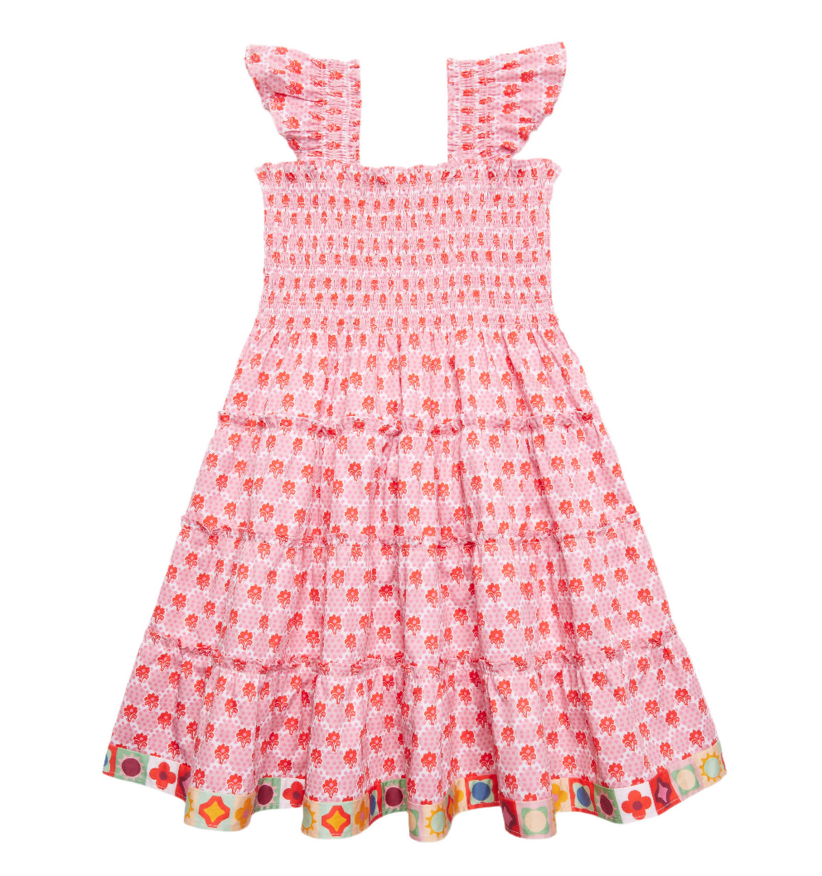 100% cotton. Elasticated smocking. Ruffled shoulders. A-line silhouette. Knee-length hem.