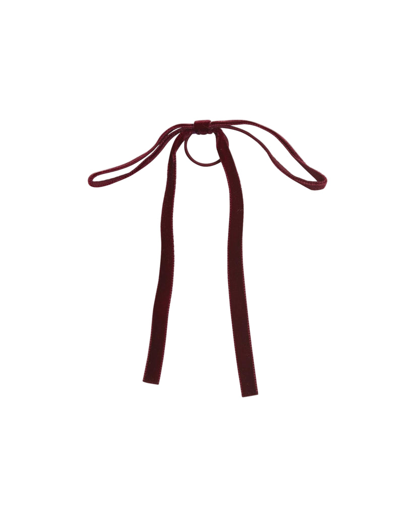 The Thin Velvet Hair Tie in Burgundy adds an elegant finishing touch to any ensemble. Handmade from luxurious velvet ribbon, this delicate bow is attached to a soft, elastic bobble for a comfortable and secure fit. A timeless accessory that pairs beautifully with any hairstyle, it also makes a thoughtful gift for any occasion.