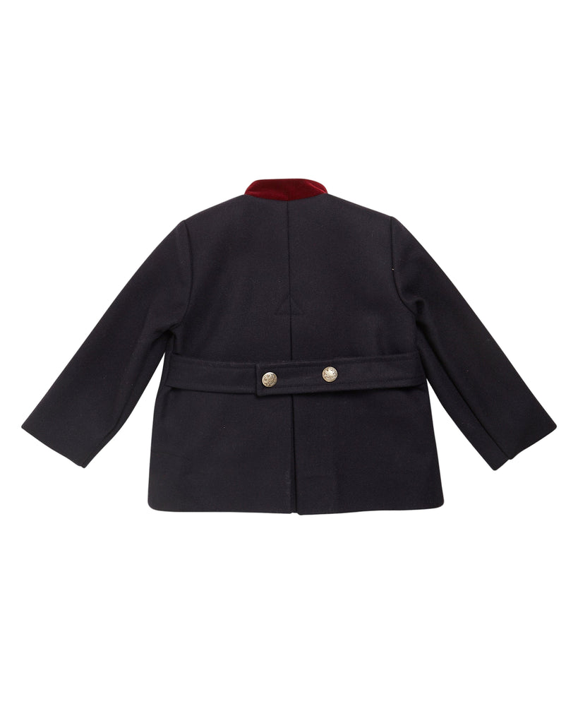 Navy wool. Dark red velvet collar and pocket flaps. Brushed nickel button fastening. Fully lined interior. Made in Spain.