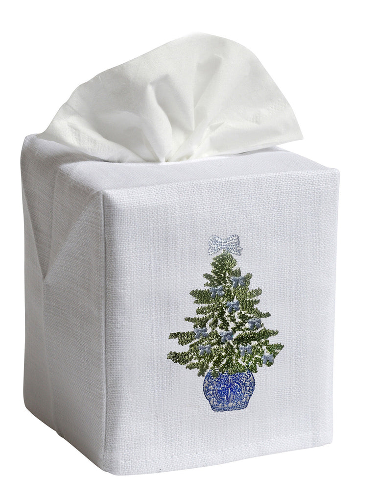 White cotton and linen blend. Chinoiserie Christmas Tree embroidery. Fits standard Puffs/Kleenex cube boxes.