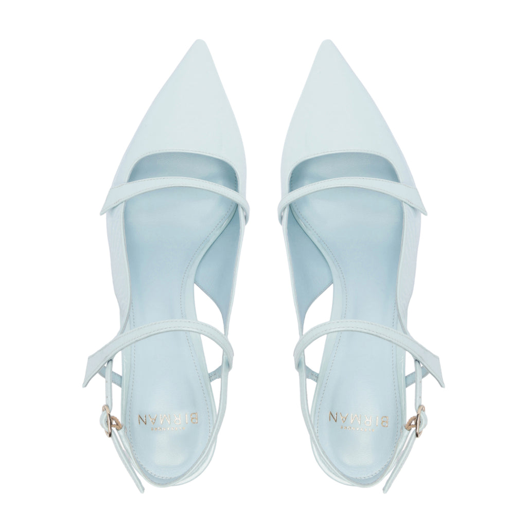Founded in 2008, Alexandre Birman infuses each of his fine footwear collections with the spirit, sensuality, and sophistication of his Brazilian heritage. Beginning with thoughtful drawings, exceptional craftsmanship is the brand’s cornerstone, employing fine artisans, superior materials, and thoughtful design to create timeless, luxurious shoes, style after style. The Tita 60 Slingback in Dust Blue offers a refined balance of femininity and form, reinterpreting the brand’s signature Tita silhouette with the poised structure of a pointed-toe pump. Crafted from supple leather with delicate slingback straps, this design elegantly frames the foot while the serene blue tone adds a fresh, modern edge.