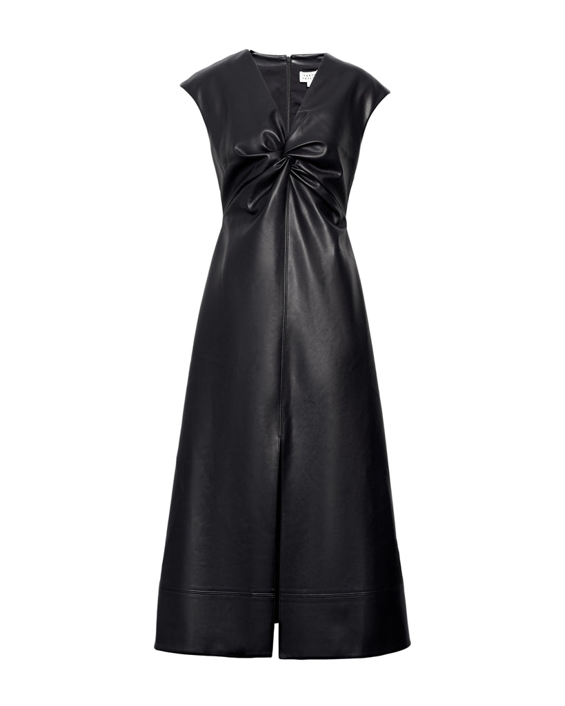 Stretch vegan leather. V-neckline. Twist detail at front waist. A-line skirt with front slit. Midi length. Concealed back zip closure. Unlined.
