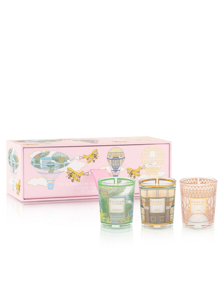 The My First Baobab Trio Travel Candle Set in Singapore, Athens & Paris invites you on an olfactory journey through three iconic cities. Each hand-poured candle is encased in a beautifully designed glass vessel reflecting the spirit of its destination—vibrant Singapore, sunlit Athens, and romantic Paris. Together, they offer a refined sensory escape, from the lush tropics to the Mediterranean and the City of Light.