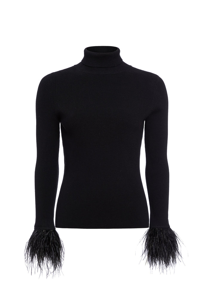Slip-on silhouette. Turtleneck. Ribbed knit with ostrich feather trim at cuffs. 80% viscose, 20% poly. Unlined.