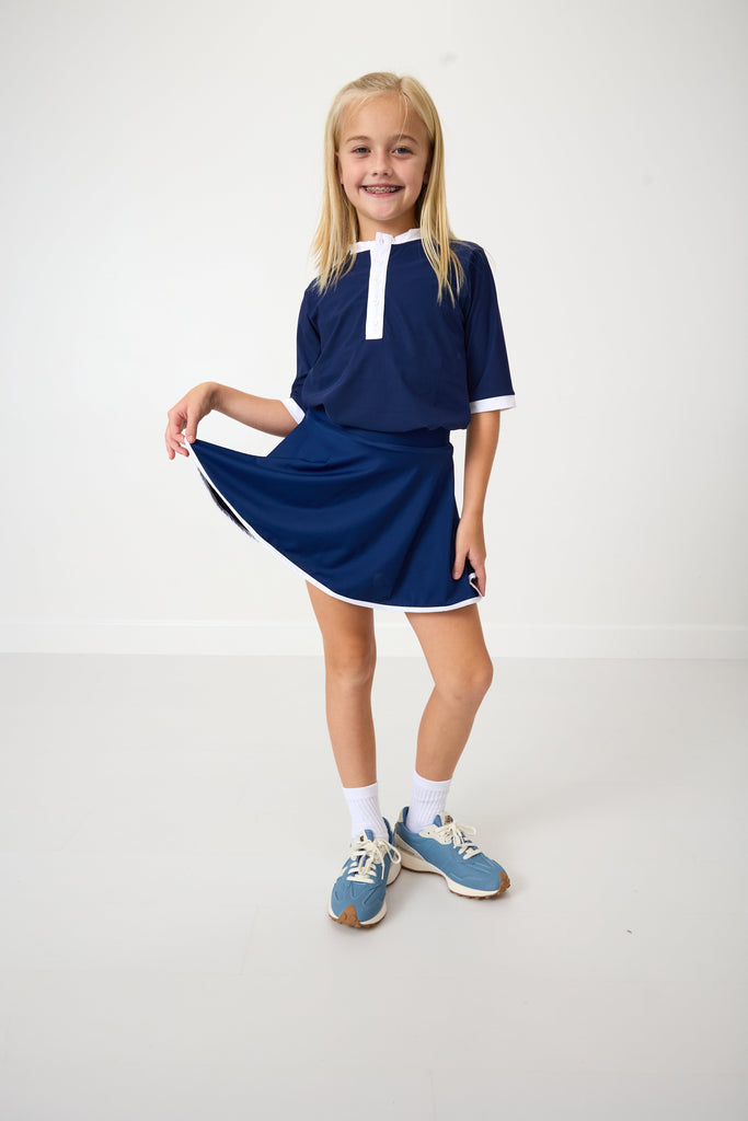 A polished blend of style and sport, Courtside Kids reimagines children’s activewear with performance fabrics, modern tailoring, and a classic athletic sensibility—made for everywhere from the playground to the country club. The Twirly Skort in Navy combines timeless tennis style with modern performance features. Designed with a flattering A-line silhouette and a thick elastic waistband, it offers both structure and stretch. Built-in anti-odor shorts with a side pocket ensure she’s ready for every serve, spin, and twirl—on or off the court.