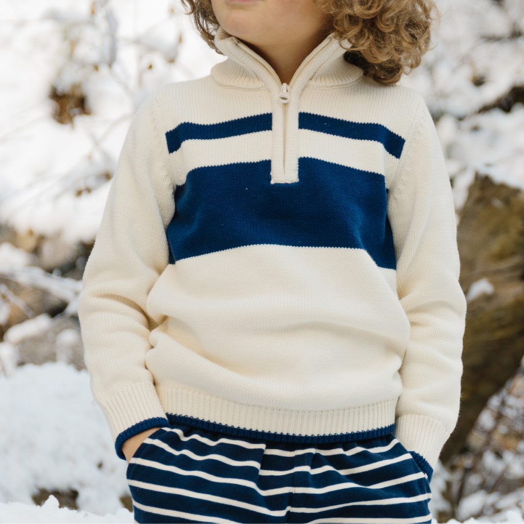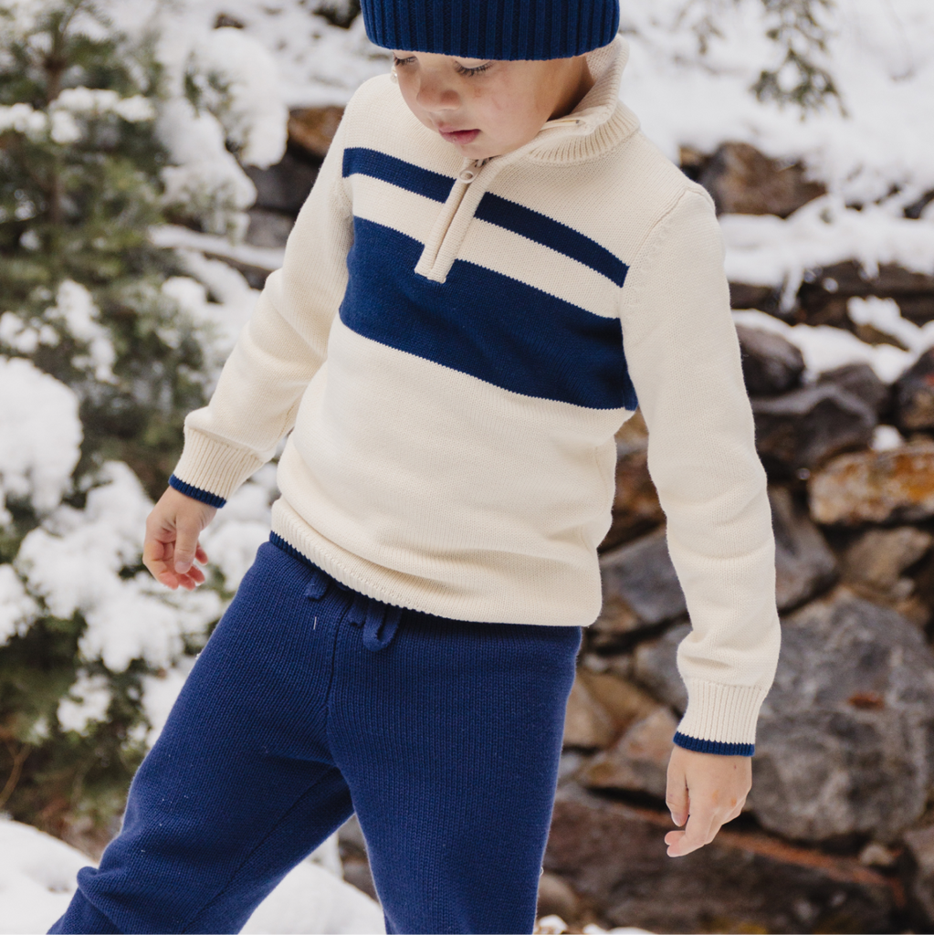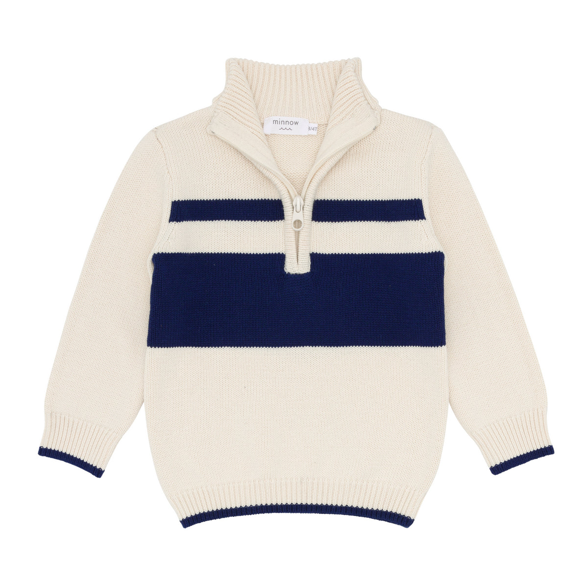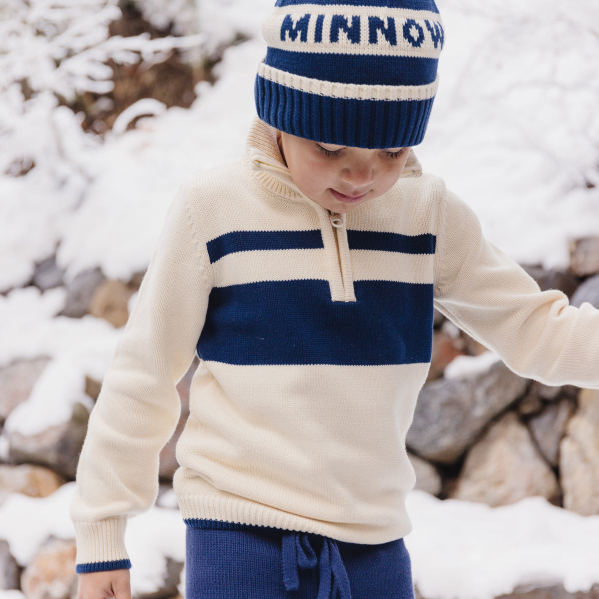 A family favorite for its clean lines and simple details, minnow creates pieces that are playful, polished, and thoughtfully designed for long days, sandy toes, and the wonderment of life on the shore. Crafted from natural cotton—for its breathability and absorbency—the cozy and ultra-soft luxury knit Unisex Cream Half Zip Sweater is the ideal warm layer for après swim. Pair it with the coordinating knit pants for a sweet lounge set.