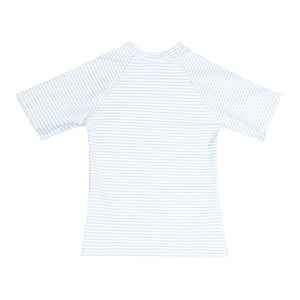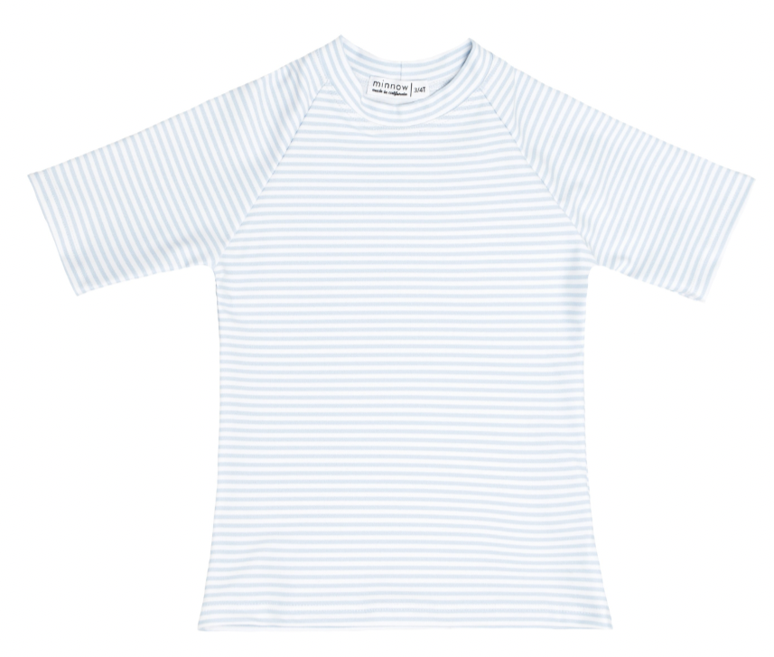 A family favorite for its clean lines and simple details, minnow creates pieces that are playful, polished, and thoughtfully designed for long days, sandy toes, and the wonderment of life on the shore. The versatile Unisex Short-Sleeve Rashguard in Powder Blue Stripe offers full UPF 50+ protection. The raglan arms are unlined and lightweight for comfort as your little one relaxes poolside.