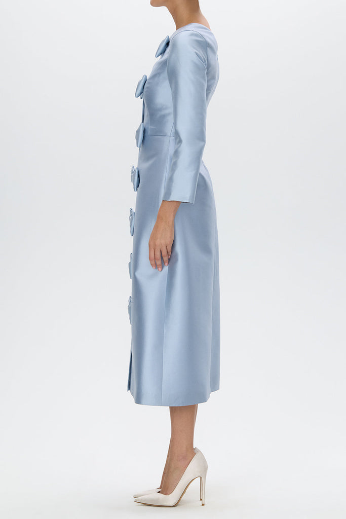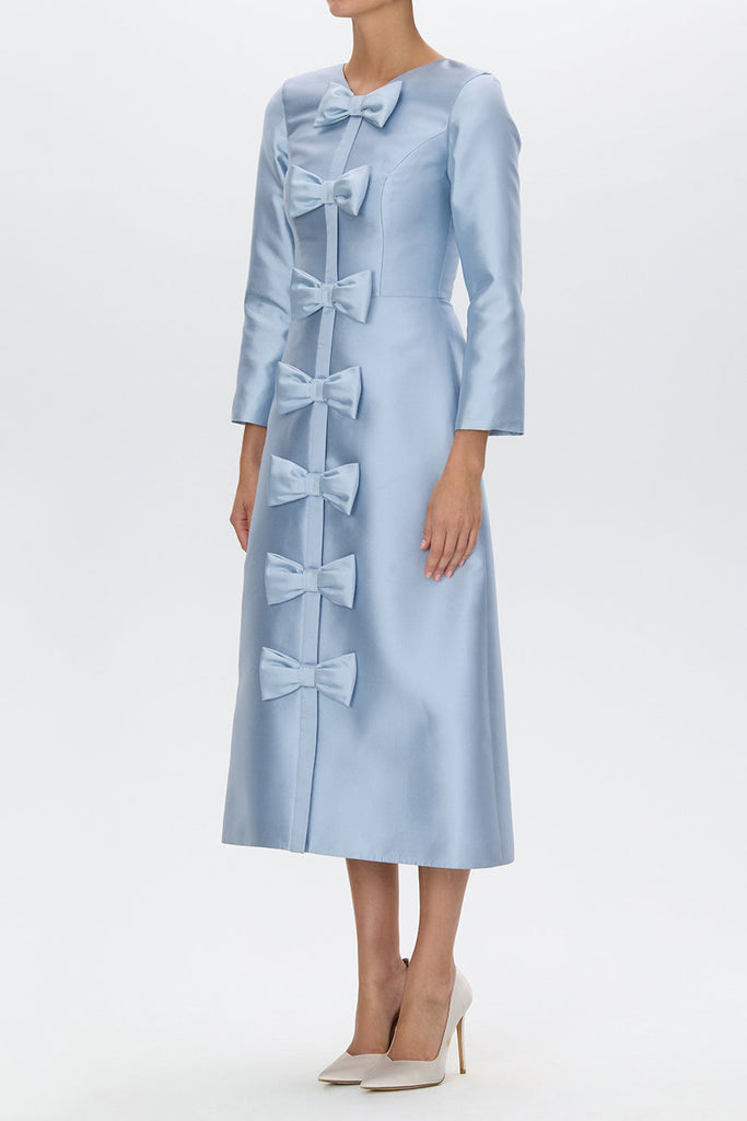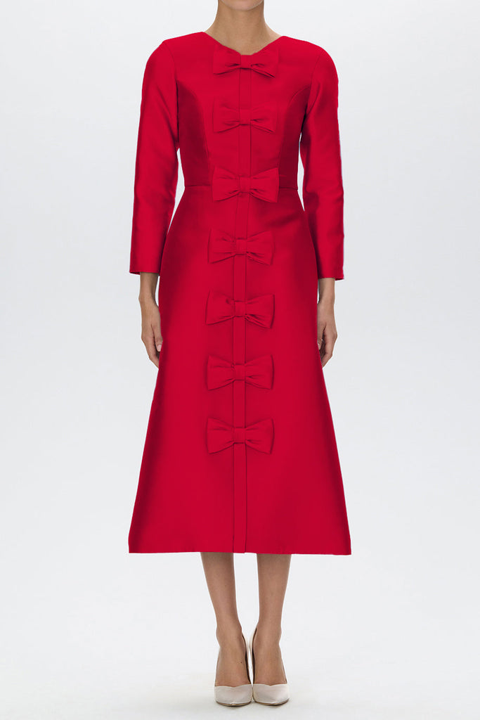 The Valentina Silk and Wool Midi Dress from the Alexia María 2026 Collection is an elegant expression of modern femininity. Crafted in a refined silk and wool blend, this sophisticated silhouette features a jewel neckline and structured three-quarter sleeves that frame the fitted bodice beautifully. A graceful A-line skirt falls to a midi length, while a vertical row of delicate bow detailing traces the front for a romantic finishing touch. Handcrafted in the California atelier, Valentina offers a polished and timeless option for cocktail gatherings and formal celebrations alike.