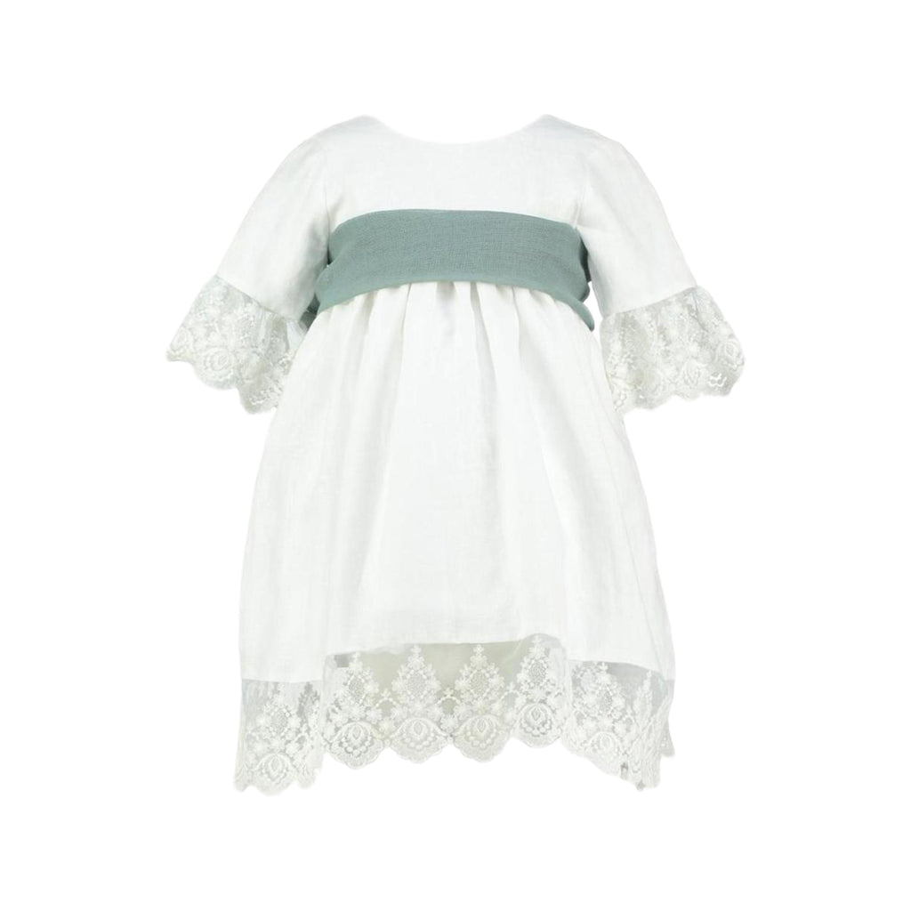 100% natural linen and cotton. Lace-edged sleeves and hem. V-shaped back with sage green tulle bow. Fully lined with petticoat for volume. Made in Spain.