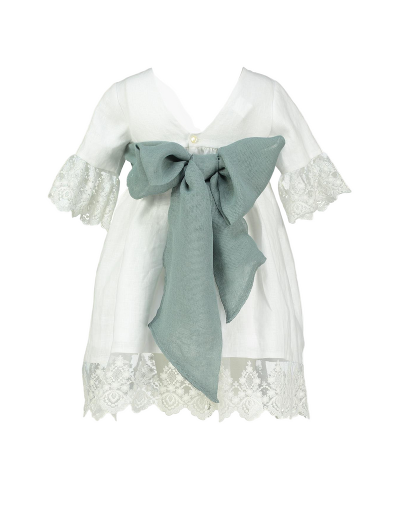 The Valeria Dress captures timeless beauty in a bespoke design crafted from 100% natural linen and cotton. This handmade party dress features delicate lace trim at the sleeves and hem, adding a touch of vintage charm. Fully lined with a petticoat for graceful volume, it is finished with a V-shaped back adorned by a contrasting sage green tulle bow—a detail that creates a beautifully refined silhouette. Ideal for flower girls, little bridesmaids, and special celebrations alike.