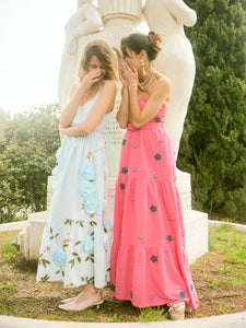 Tomboy looks, girly-girl styles, and an always fashionable approach define EDDY’s aesthetic. With a focus on bold and feminine silhouettes, EDDY dresses and tops pair elevated California bohemian with global inspiration; these are clothes designed to make you feel good inside and out. Meet the Valeria Dress in Lotus Garden Blue—a dreamy midi made for garden parties, golden hour, and everything in between. Crafted in blue cotton-linen with sculptural floral appliqué blooming across the skirt. Hand-placed petals, leafy embroidery, and a pearl-trimmed neckline add layers of quiet romance. Finished with a hidden side zip, delicate button skirt details, and a softly defined waist.