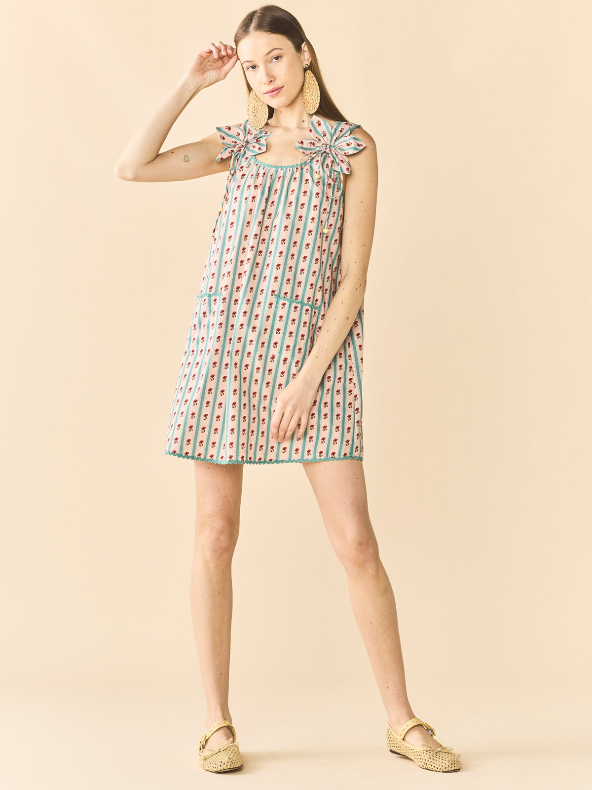 100% BCI cotton. Lightweight cotton with vintage-inspired stripe and dainty floral print. Adjustable shoulder ties with oversized rosette detail. Easy, mini silhouette. Side pockets. Fully lined. Slip on. Made in India.