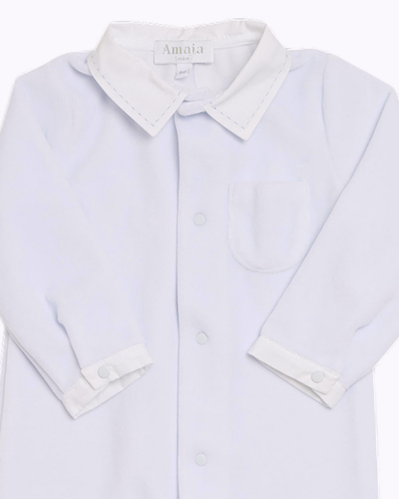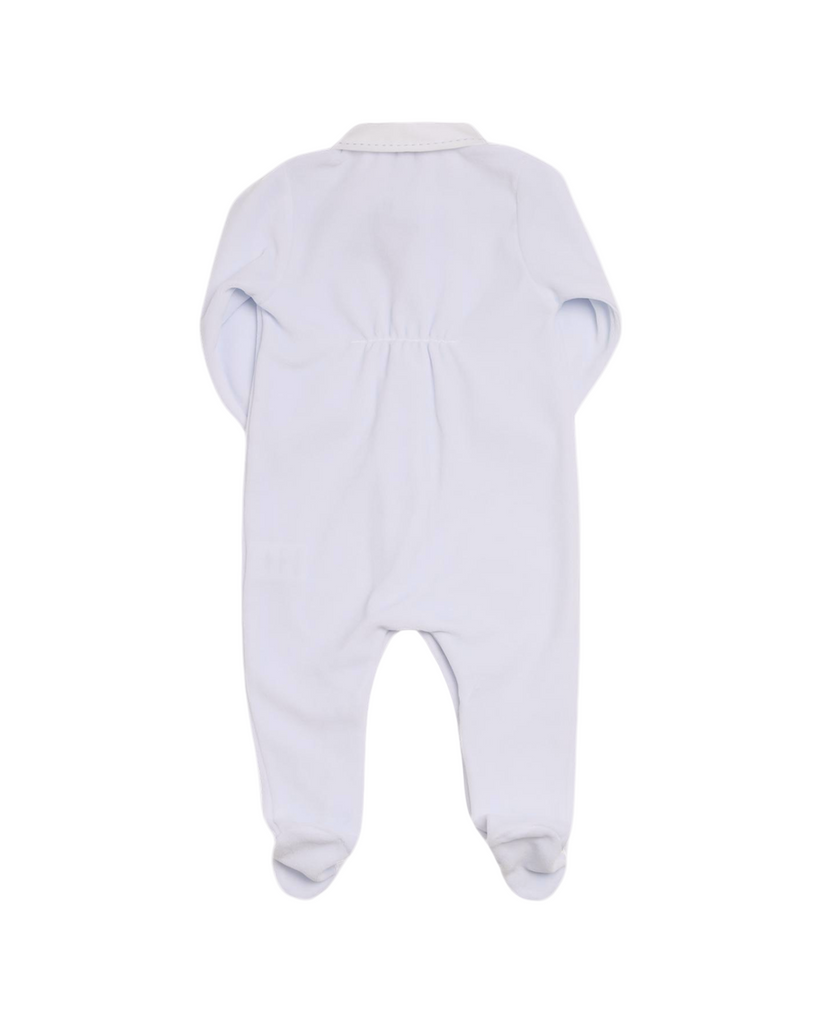 Soft cotton velour in light blue. Embroidered white cotton Peter Pan collar. Chest pocket and buttoned cuffs. Popper fastenings at front and between legs. Made in Spain.