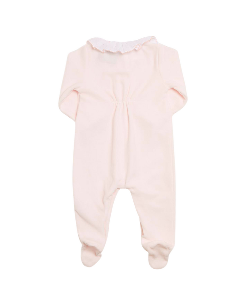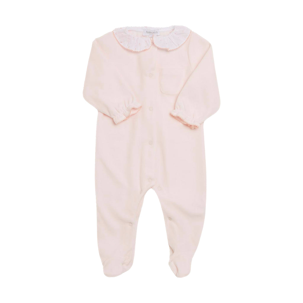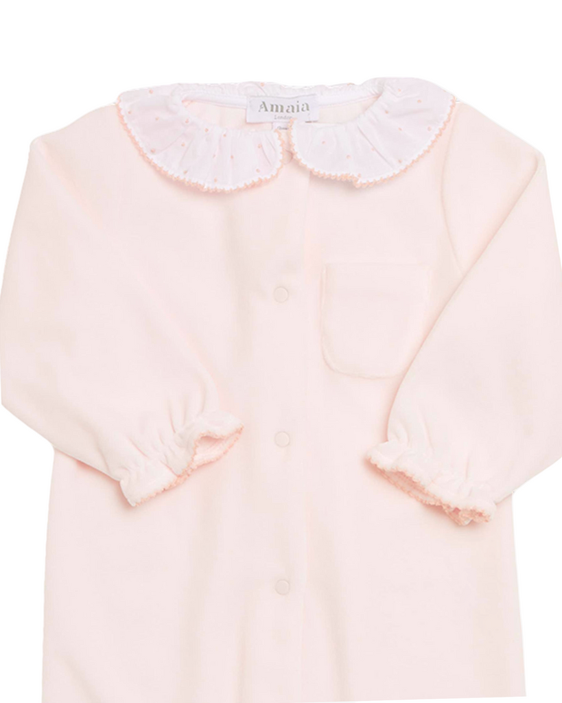The Velours Babygrow in Light Pink is a cozy essential for little ones, combining softness and style in one timeless design. Made from plush cotton velour, this warm one-piece features a contrast white cotton Peter Pan collar with delicate embroidery, a small chest pocket, and buttoned cuffs. Popper fastenings at the front and between the legs ensure easy changing and all-day comfort.