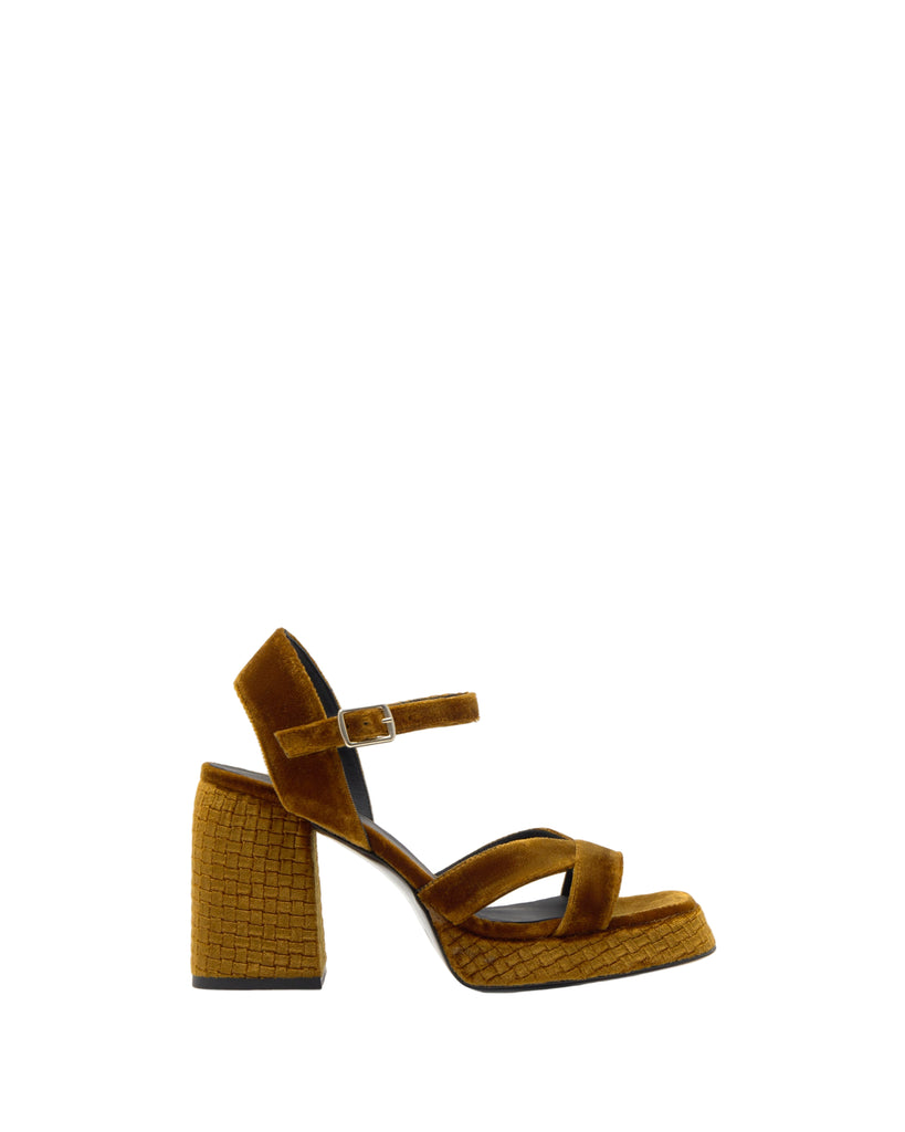 Sandal style. Cotton velvet upper. Braided detailing on heel and platform. Buckle closure. Gold-tone padded insole. 4" heel.