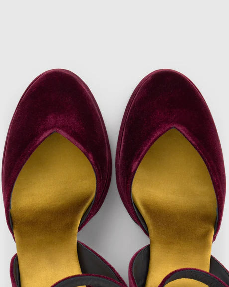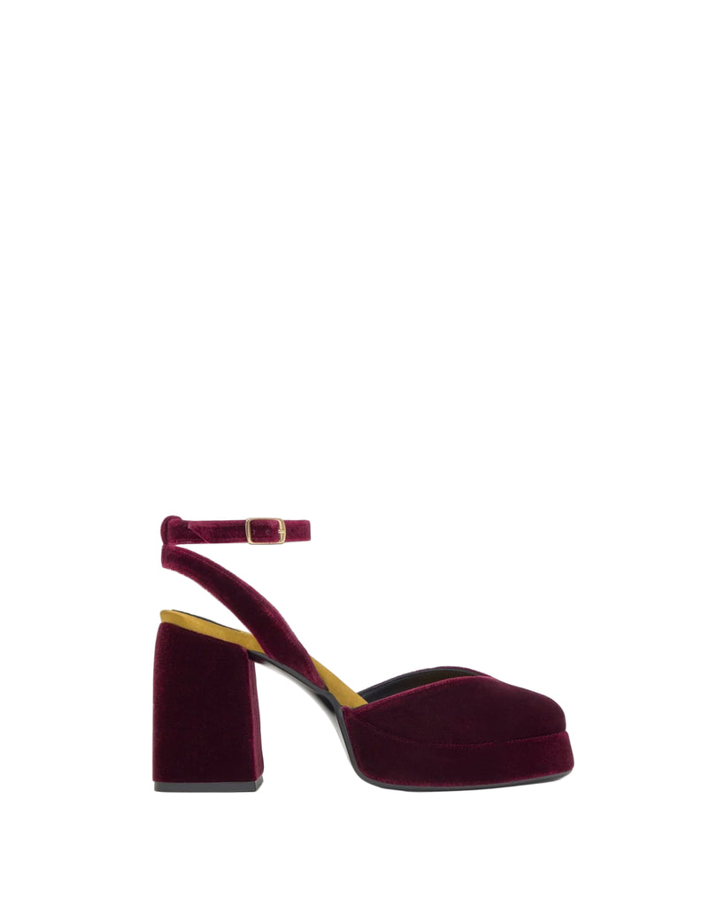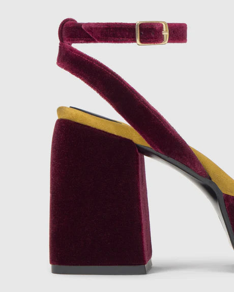 Founded in 1927, Castañer has elevated the espadrille into a sophisticated symbol of timeless design. With a commitment to craftsmanship, tradition, and natural materials, the brand continues to blend heritage with innovation, earning global recognition while staying true to its authentic roots. The Verona in Bordeaux brings luxurious texture to the classic pump, crafted in cotton velvet with a refined ankle strap. A gold-tone cushioned insole and a 4" covered heel complete the silhouette, balancing richness and modern elegance.