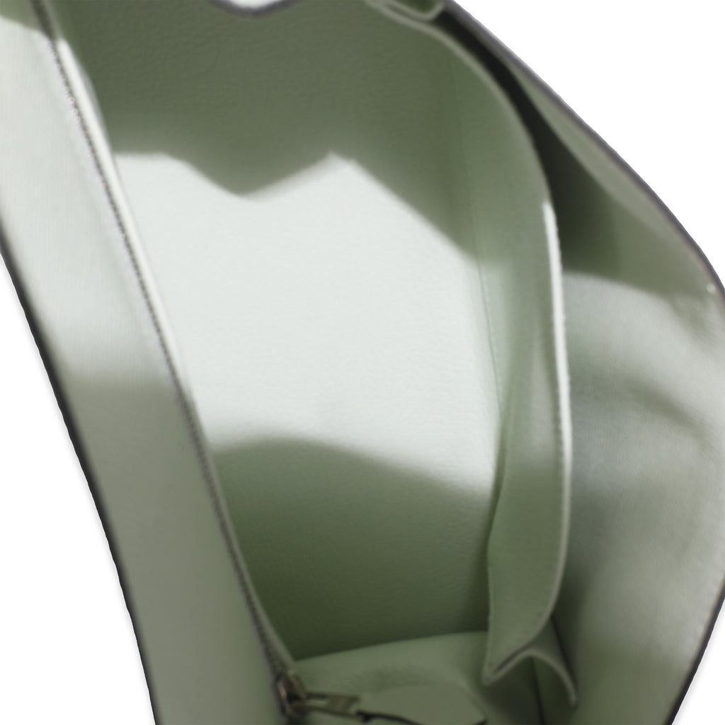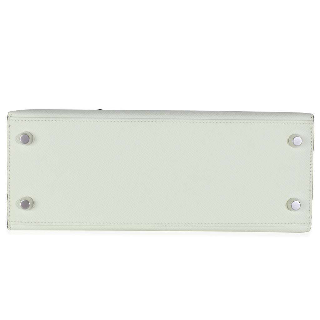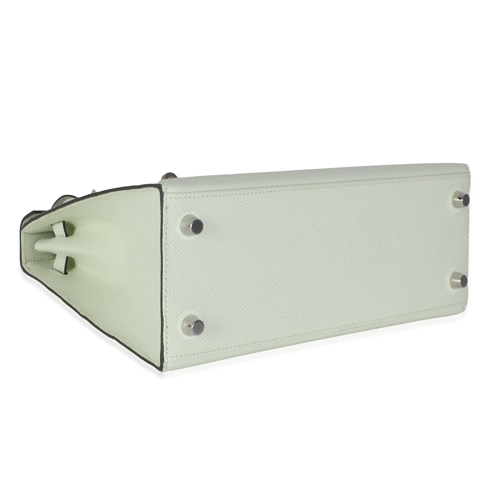 Pre-owned Hermès Kelly 25 Sellier in Vert Fizz Epsom leather with palladium hardware, circa 2022. Item has no indication of wear. Features a top handle, removable shoulder strap, flap closure with turn-lock fastening, and leather interior with zip and slip pockets. Includes original box, clochette, dustbag, lock, keys, gift ribbon, felt protector, and removable strap. Made in France.
