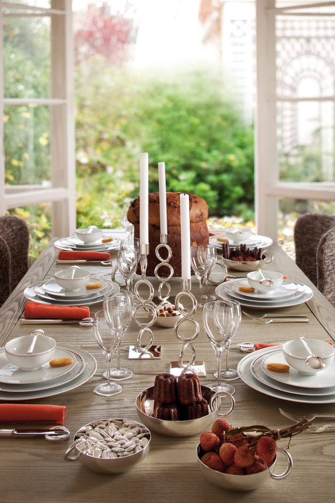 Silver-plated. Single handle (bangle style). Designed for snacks, small bites, or decorative use. Embodied by Andrée Putman’s signature Vertigo ring motif—subtle asymmetry, bold geometry. Gift boxed.