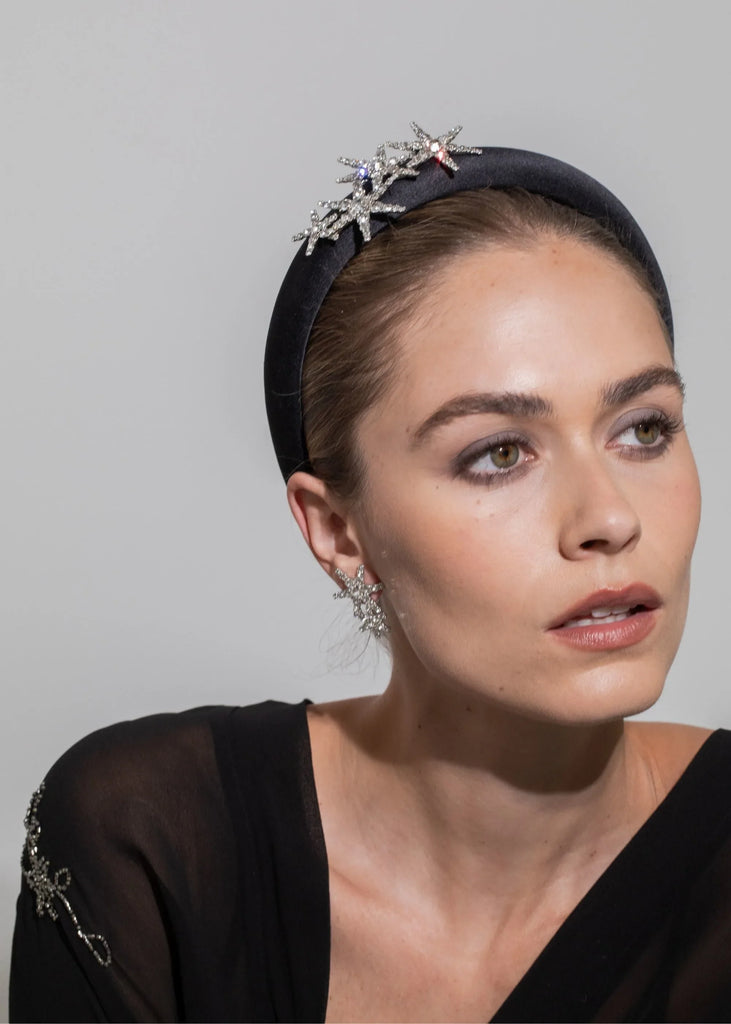 “Everything has a story to tell,” says Jennifer Behr, the founder of her namesake luxury hair accessory brand that has blossomed into one of New York City’s foremost ateliers for jewelry, as well as bridal. In every crystal, pearl, and ribbon, you’ll find the utmost quality and a sense of romance, as each piece reveals a modern interpretation of centuries-old regalia. The Vespera Headband in Black reimagines classic elegance through the contrast of lustrous silk satin and structured crystal embellishment. Handcrafted in New York, fine Austrian crystal stars adorn a padded silk-satin base, angled slightly forward to create a striking, jewelry-like effect.