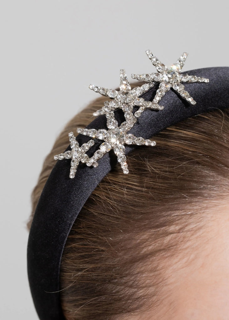 Silk-satin covered padded headband. Fine Austrian crystal star embellishments. Handmade in New York City.