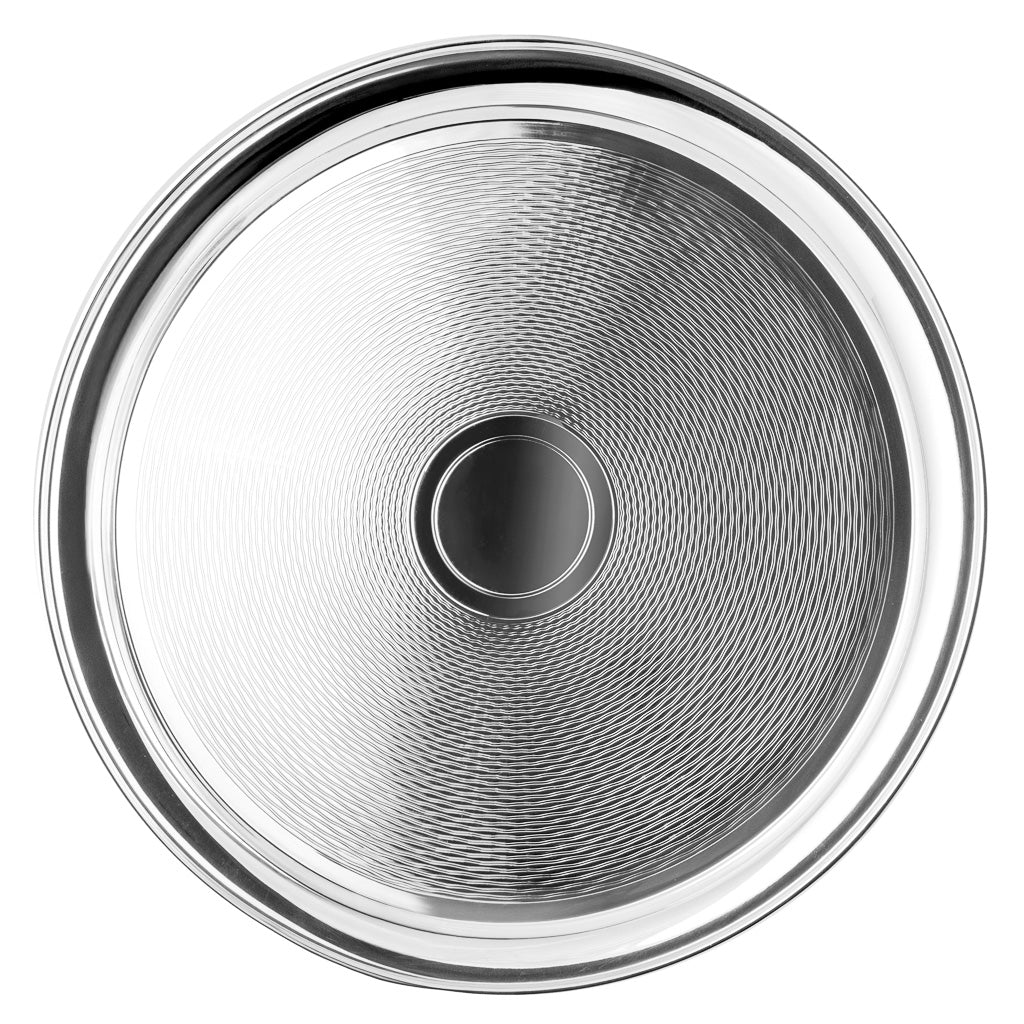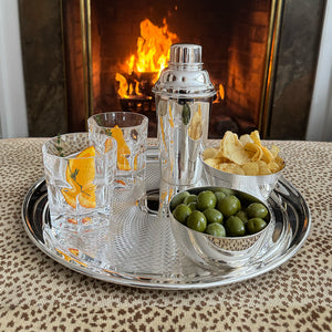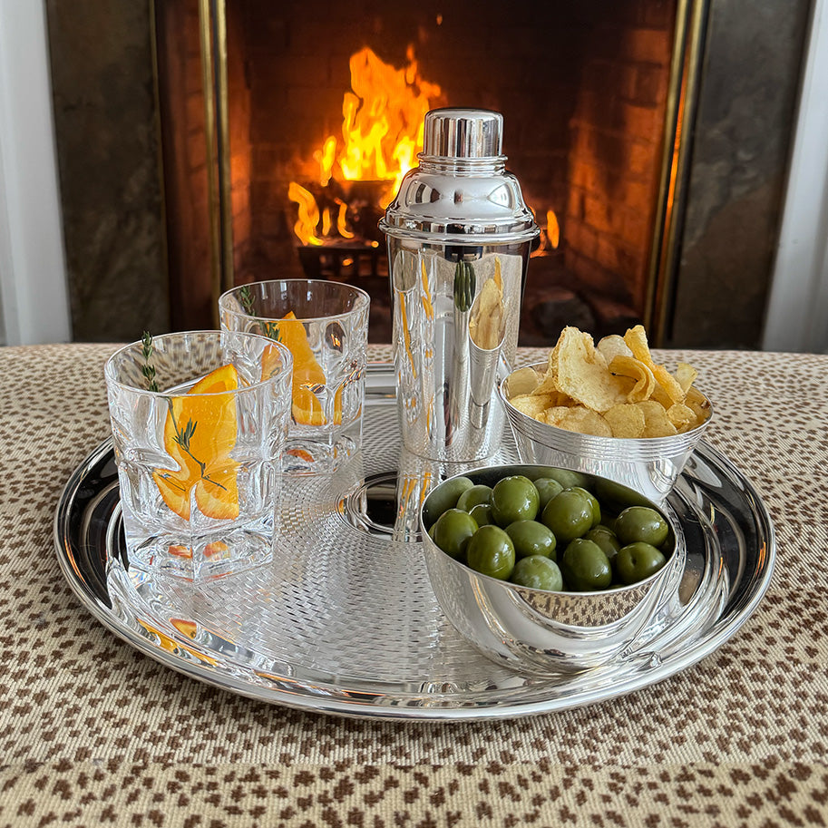 Hôtel Silver is a curated collection of European hotel silver and barware—vintage and new—established in 1988. Known for its casual elegance, the brand’s streamlined design is timeless and effortlessly complements any setting. The Vintage 14" Round Engine-Turned Tray exudes chic with its Deco details. It’s the ideal size for serving hors d'ouevres, cocktails, coffee ,or tea. When not in use for entertaining, keep the trays upright against a kitchen or bar backsplash for a touch of reflection in the room.