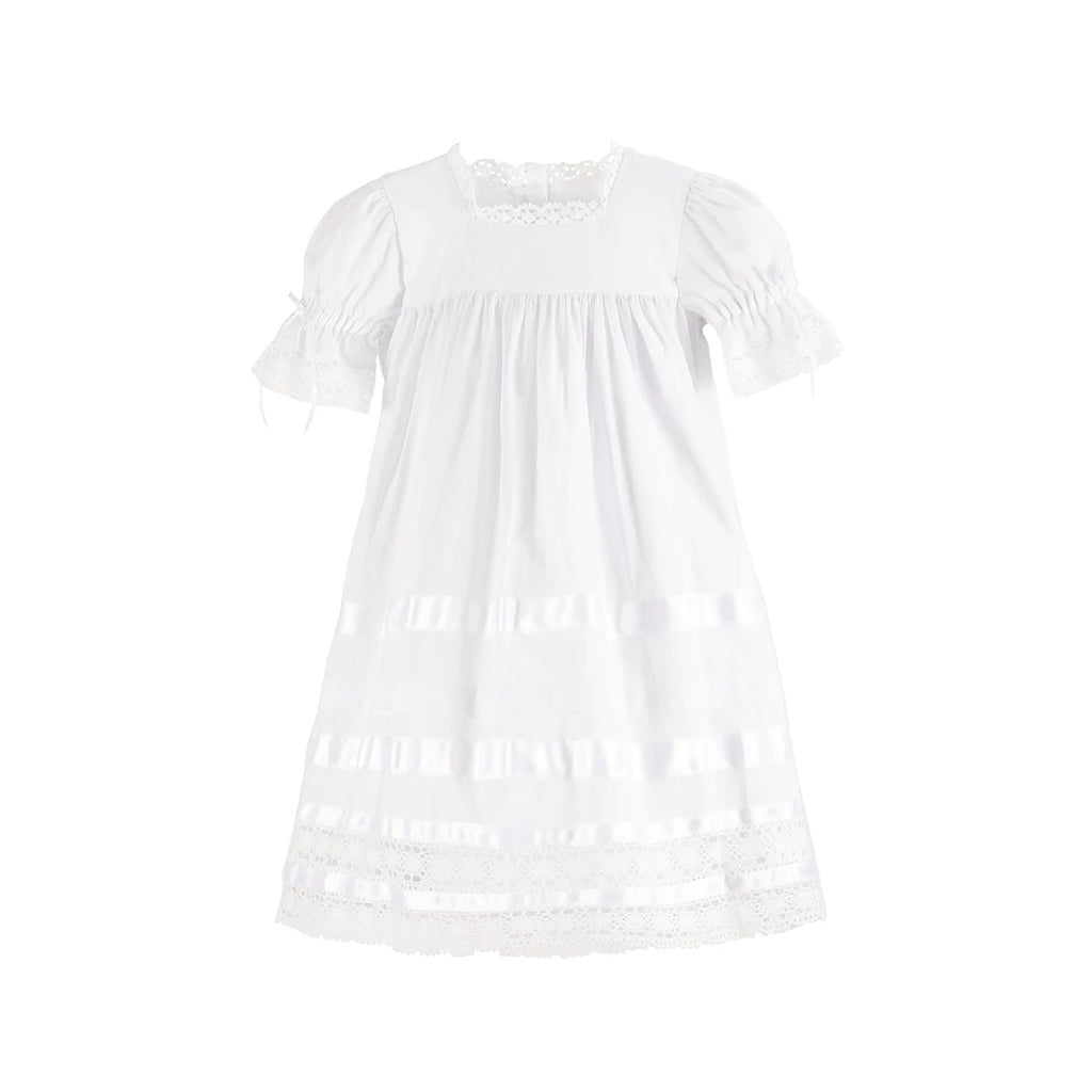 Using artisan seamstresses to craft small orders of their heirloom pieces, Strasburg Children pays special attention to details—French seams, built-in slips, and fabric-covered buttons—for lasting quality and comfort. Soft lace accents on the sleeve, neckline, and hem, as well as delicate satin ribbon bands, give the Virginia Lace Flower Girl Dress its darling vintage look. Your little one will easily be the best-dressed at weddings, Christenings, Easter brunch, or any event that calls for an elegant white dress.