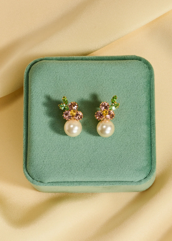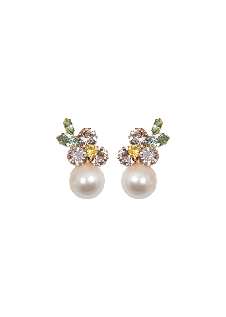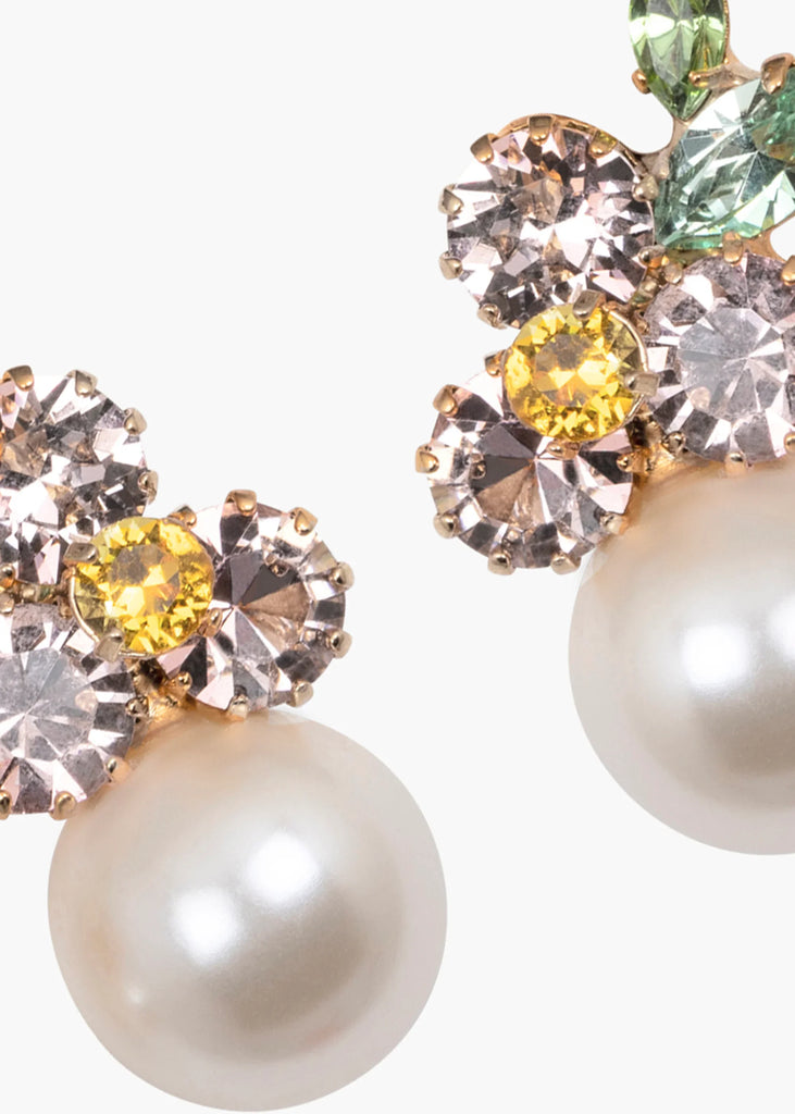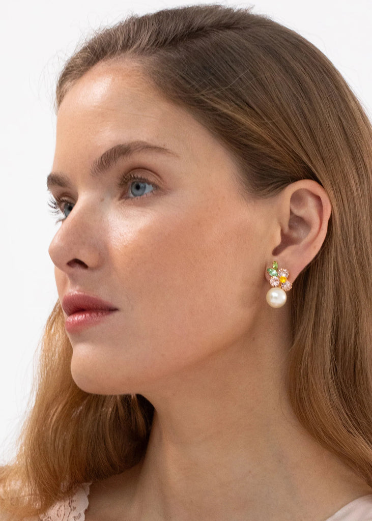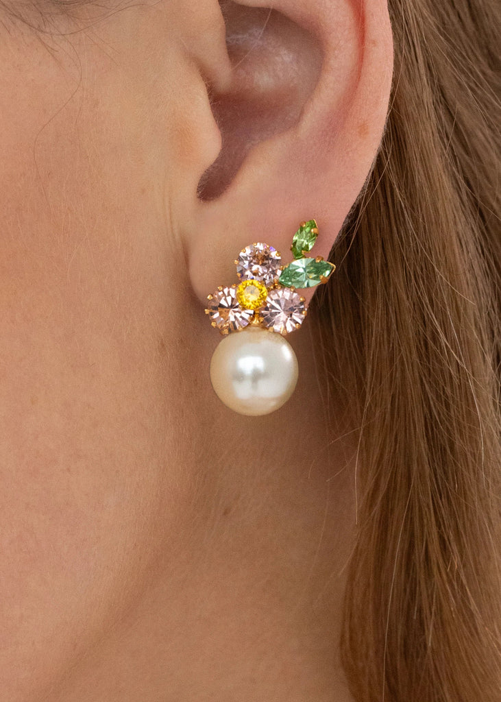 The Vivi Earrings in Vintage Rose showcase a delicate floral motif elevated with a graceful drop. Handcrafted in New York, Austrian crystals in varied shapes and sizes are arranged like a mosaic, creating a painterly floral composition. Crystal pearls are selected for their natural luster and subtle color, harmonizing with the design for a refined, luminous effect.