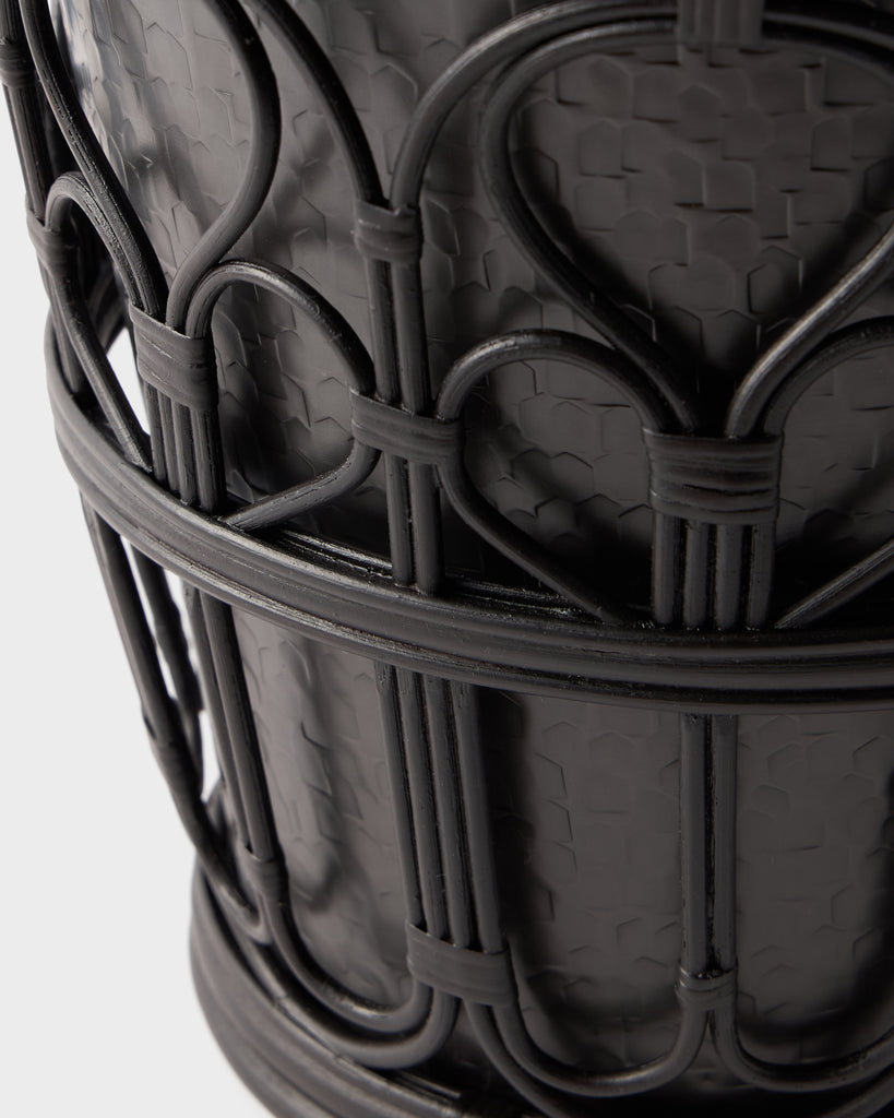 Brass with bronze finish. Handwoven cane sleeve. Semi-precious stone inlay. Made in India.