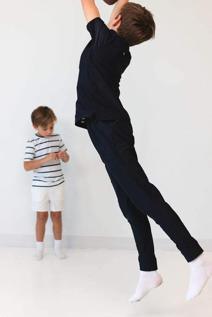A polished blend of style and sport, Courtside Kids reimagines children’s activewear with performance fabrics, modern tailoring, and a classic athletic sensibility—made for everywhere from the playground to the country club. The Warm-up Joggers in Black combine buttery-soft comfort with a sleek, modern fit. Designed to hit just above the ankle for a tailored look, these versatile joggers move effortlessly from school to sports to special occasions—keeping active boys comfortable, polished, and ready for anything.