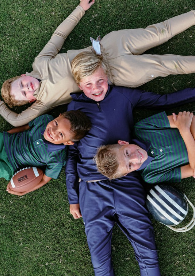 A polished blend of style and sport, Courtside Kids reimagines children’s activewear with performance fabrics, modern tailoring, and a classic athletic sensibility—made for everywhere from the playground to the country club. The Warm-Up Joggers in Khaki are the ultimate fall and winter essential, blending buttery-soft comfort with a sleek European fit that hits just above the ankle for a refined look. Crafted from a premium recycled polyester and spandex blend, these versatile joggers move effortlessly from school to sports to dressed-up occasions—and pair easily with a coordinating half-zip or pullover for a complete, ready-to-go outfit.