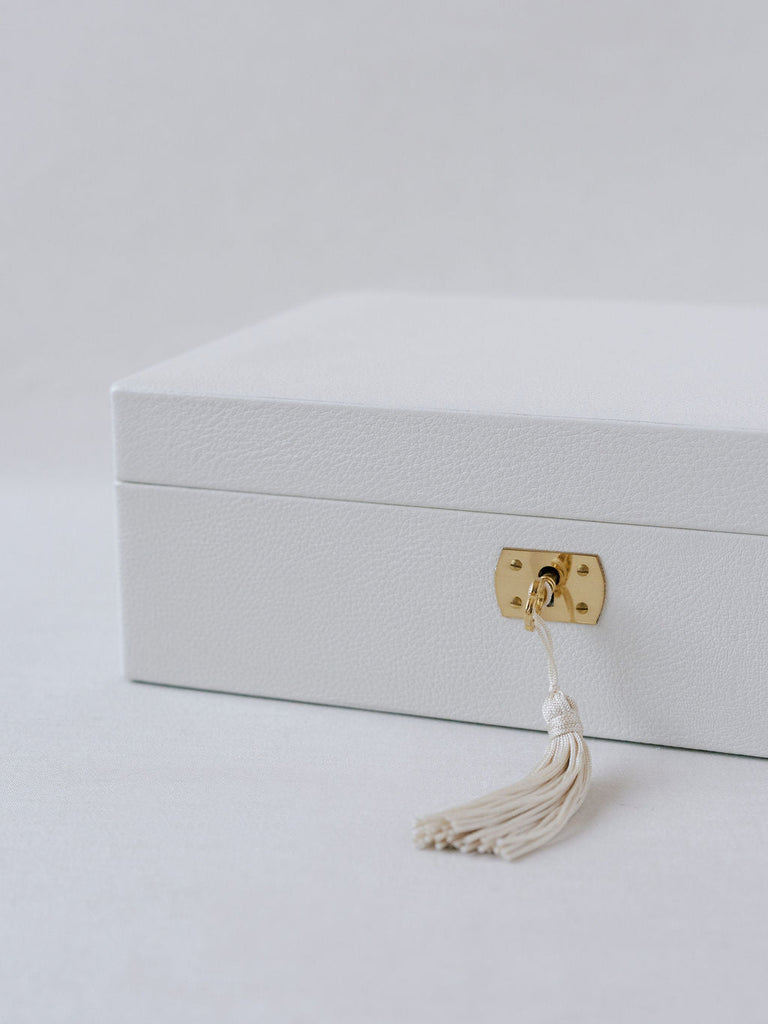 Arriving from the world of interior design, Maria Caruso Martin now shares her signature sophisticated style with brides and fashionable women looking for the perfect wedding day accessories and forever heirlooms. Your "something blue" is here. The Wedding Keepsake Box is carefully designed to hold wedding day heirlooms and keepsakes. Handmade in a white pebble, textured, leather exterior, suede interior, it's adorned with a gold lock, key and tassel. This wedding day memory box is sure to hold cherished wedding day memorabilia for generations to come (just imagine opening it up and sharing it with your grandchildren).