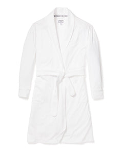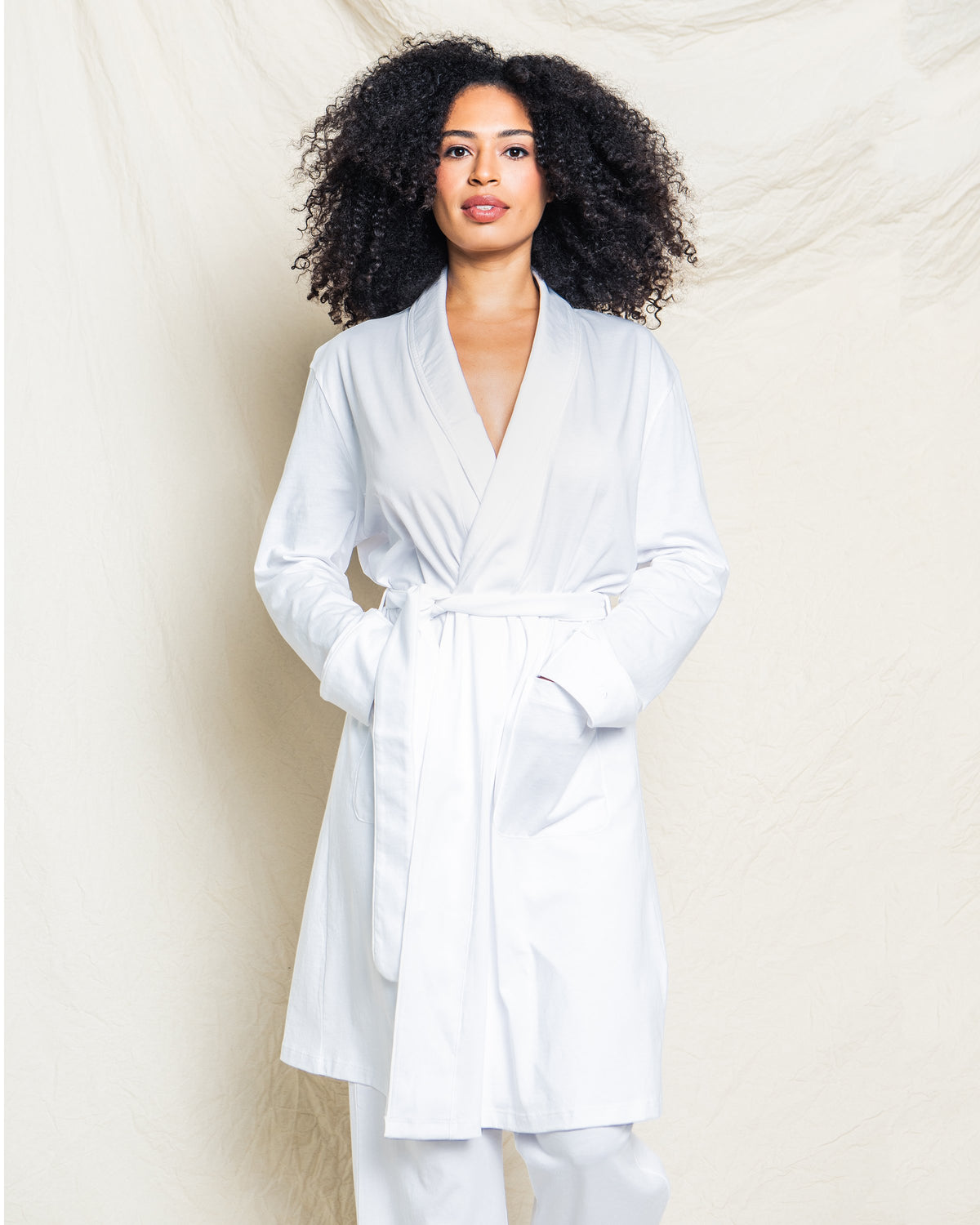 Petit Plume’s luxury sleepwear is a dream come true. Crafted in exquisite cotton, with the finest attention to detail, no chemicals, and classic silhouettes, Petite Plume delivers the utmost comfort and sophistication to every man, woman, and child who wears it. Made from the finest jersey, including 100% Peruvian Pima cotton, the Women’s White Pima Cotton Robe will get softer and more supple feeling with every wash. We love it in this shorter style.