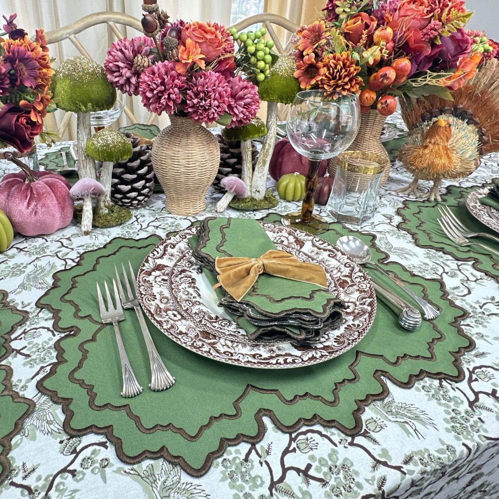 Swiss linen, fine cotton and tasteful refinement define Flying Sheep Country’s linens and tabletop items. Founded by two sisters who spent their youth spotting sheep in the English countryside, the brand celebrates both luxury and whimsy in its vibrant prints, fine embroidery and traditional artisanship. The Whitley Placemat in Fern & Cocoa, Set of 4, is distinguished by rich fern green fabric adorned with intricate cocoa brown embroidery. This sophisticated neutral lends itself to year-round entertaining—grounding autumn tablescapes, adding elegance to winter dinners, and bringing chic versatility to both casual and formal settings.