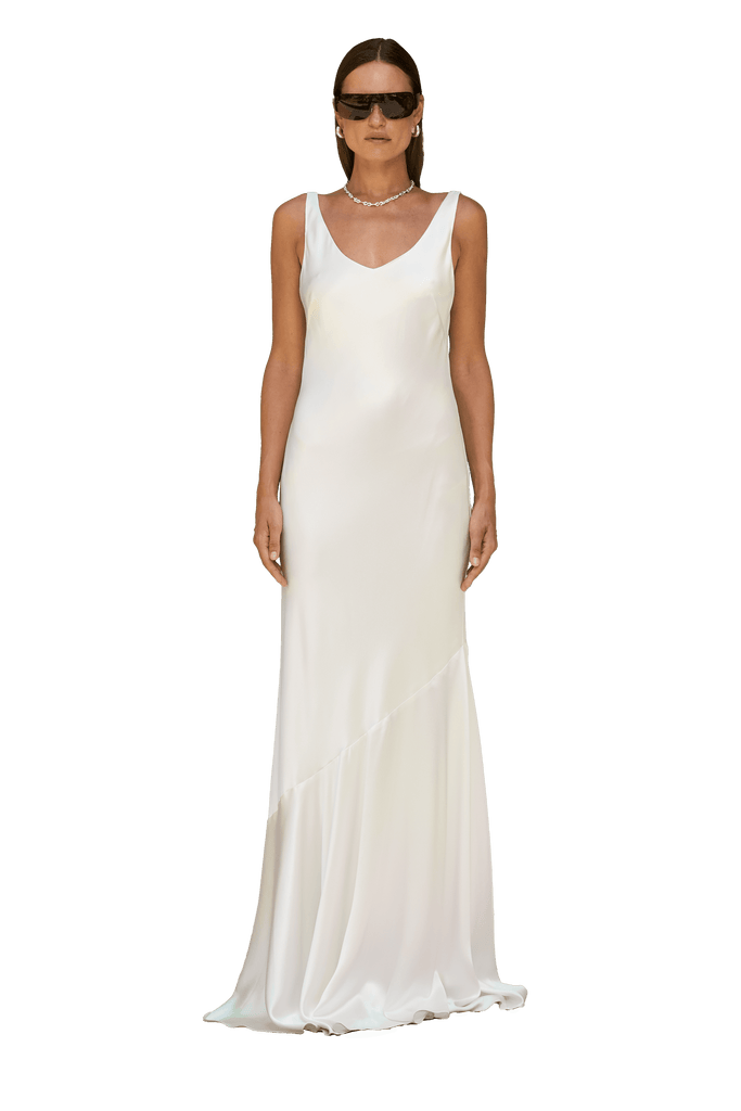 Handmade at its London atelier, The OWN Studio’s signature style combines pared-back, contemporary silhouettes with unexpected vintage details resulting in considered, minimal styles for the modern woman. The label brings a fresh and contemporary approach to wedding and evening wear. Less is more with this classic 90s style bias cut slip wedding gown with its tapered wide strap and extra movement in the skirt with the asymmetric seam at the base of the gown. Crafted in lustrous signature silk satin, the Wide Strap Slip with Asymmetric Seam | STYLE 032 is made for dancing.