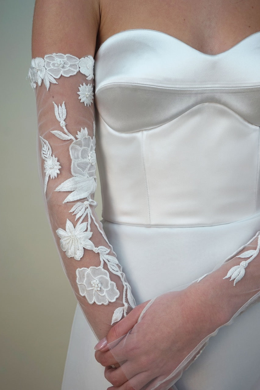 Renowned for her exquisite, artful collections, British designer Hermione de Paula brings experience from the world’s leading couture houses to her namesake bridal wear. Surrealist prints, elaborate hand-drawn artwork, and intricate embroidery come together by a luxurious, artisanal hand in every one of these romantic creations. Elevate a dress with delicate tulle gloves, designed to add a touch of timeless elegance. Featuring a beautifully crafted floral border along the top edge and intricate embroidered and beaded flowers cascading towards the cuff, these gloves are the ultimate finishing touch to complete your look.