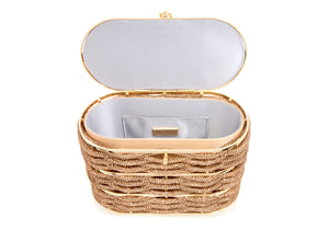 Judith Leiber is an iconic American accessories brand known for its meticulous attention to detail and flawless hand craftsmanship. Counting First Ladies, including Jackie Kennedy, and A-listers from Beyoncé to Jennifer Lawrence among its many acolytes, the label impresses with its signature take on luxury. The oval shaped Willow Basket in Champagne Topaz handbag, crafted to resemble a basket with silver woven crystal intricately laced through gold hardware. The crystal embellished top, flaps down with a latch closure and features a silk tassel with a JL medallion. Finished with a leather top handle, it is a must have.