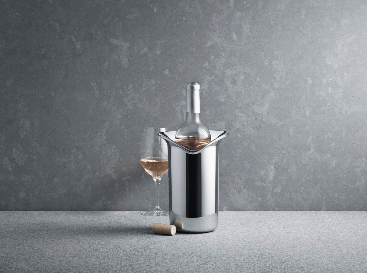 For over a century, Georg Jensen has developed jewelry, silverware, and home decor with purposeful, timeless, and functional beauty in mind. Rooted in Scandinavia, and inspired by the lines of Art Nouveau, the brand innovates, sustainable, unmistakable design with a distinctive vigor and unmatched quality. Keeping wine at the upmost temperature is an important part of serving and enjoying—do it in style with the sophisticated Wine & Bar Cooler. This stainless steel cooler is constructed in two layers to give an insulating effect that keeps the ice cold for longer. Finished with an organic sculptural form that brings a touch of Scandinavian design to your home bar.