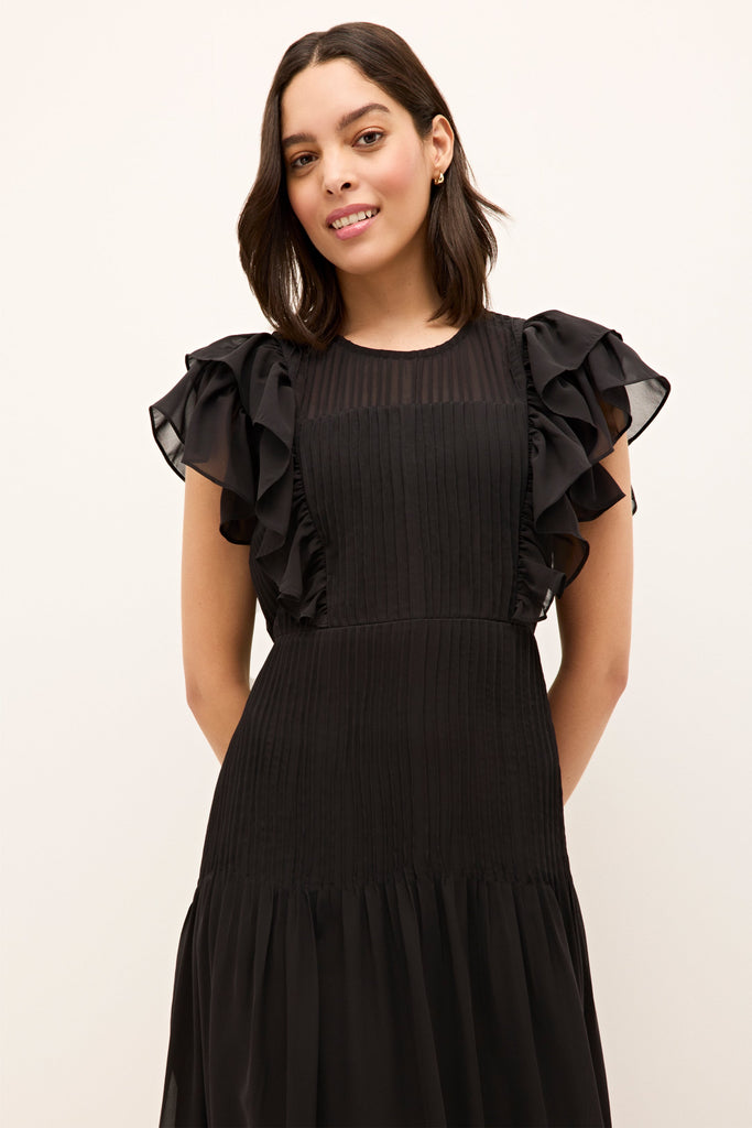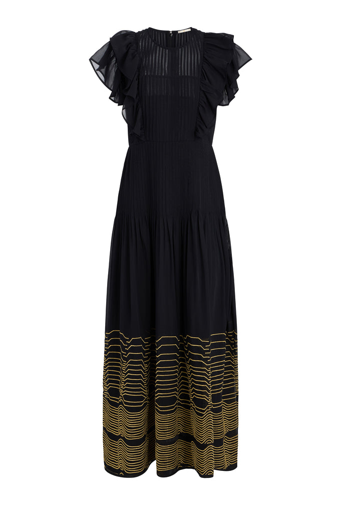 Empowering women through vivid hues and the joy of style, Sarah Doggett Evenson uses her archive of artistic prints, fine fabrics, and flattering silhouettes to make each Marie Oliver piece instantly uplifting. The Winfrey Dress in Black with Gold Embroidery is a dramatic maxi designed with pintuck pleating through the bodice and hips, and finished with romantic flutter sleeves. Its classic black ground, embroidered in metallic gold, creates a striking visual that feels both timeless and celebratory.