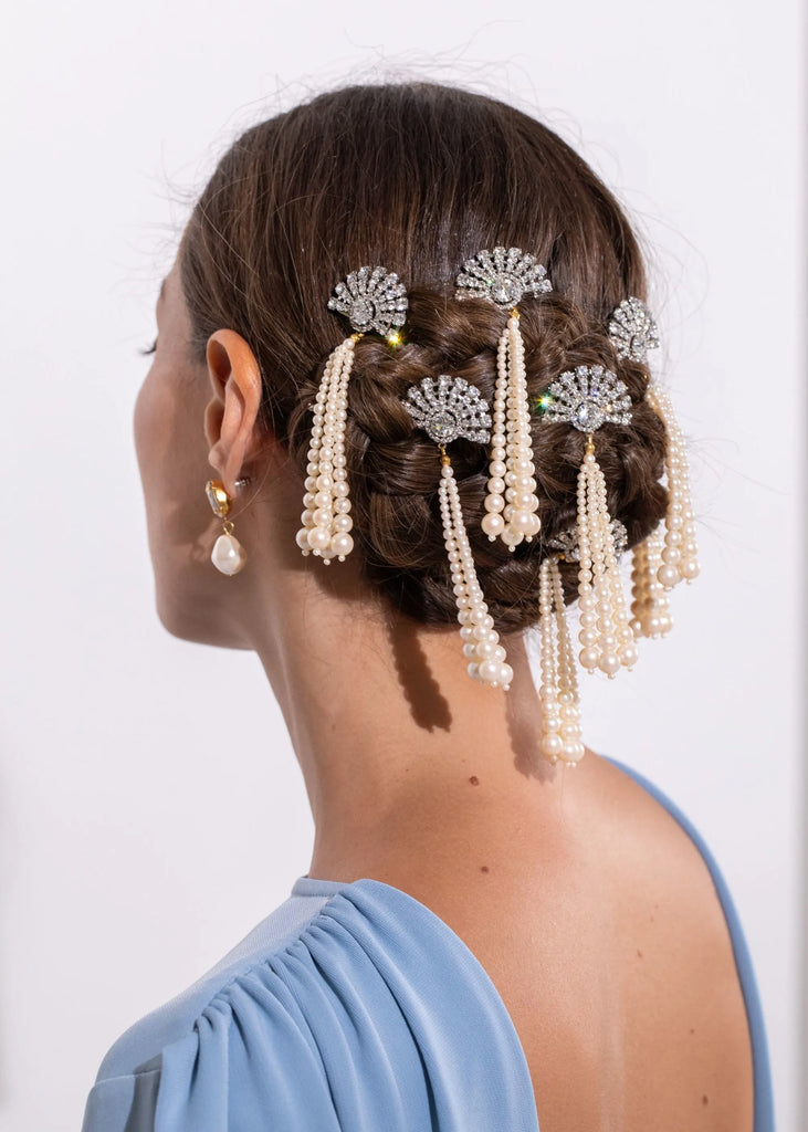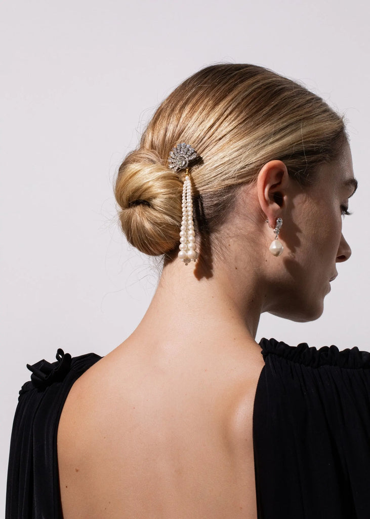 “Everything has a story to tell,” says Jennifer Behr, the founder of her namesake luxury hair accessory brand that has blossomed into one of New York City’s foremost ateliers for jewelry, as well as bridal. In every crystal, pearl, and ribbon, you’ll find the utmost quality and a sense of romance, as each piece reveals a modern interpretation of centuries-old regalia. The Winifred Bobby Pin in Crystal Pearl channels Art Deco glamour with its fan-inspired silhouette, hand-set Austrian crystals, and a rare vintage 1970s Japanese pearl tassel chosen for its fluid movement and luminous sheen. Handcrafted in New York, it secures effortlessly for an elegant statement.