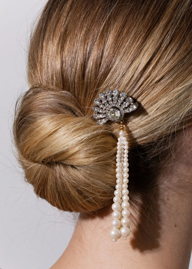 Rhodium-plated brass setting. Fine Austrian crystals with vintage 1970s Japanese pearl tassel. Curved bobby pin design for a secure, comfortable fit. Handmade in New York City.