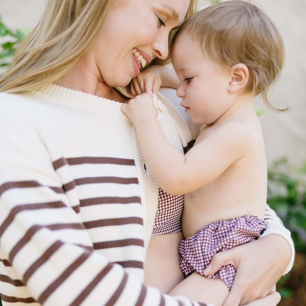 The Women’s Cream and Brown Stripe Cropped Knit Cardigan reimagines a Minnow favorite in a timeless button-front silhouette. Ultra-soft and effortlessly cozy, it features a relaxed fit and classic striping that make it an elevated layer for cool seaside mornings or everyday wear. Pair it with coordinating knit pants or any Minnow staple for a polished, easy look.