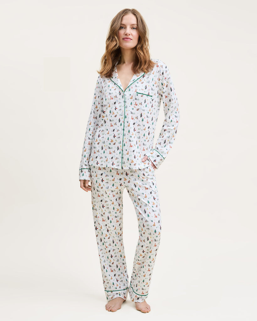 Petite Plume wishes you a “bonne nuit,” and in their luxury sleepwear, it’s hard not to oblige. The Women’s Pima Pajama Set in Merry Meow brings whimsy to the holidays with a playful print of festive felines—an homage to beloved pets who brighten the season. This timeless silhouette is tailored with thoughtful details that balance elegance and ease, making it a cherished addition to your holiday sleepwear collection.