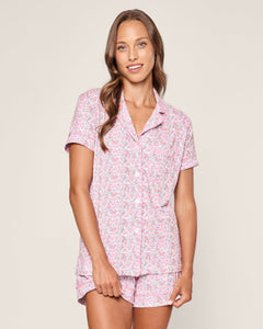 Petite Plume wishes you a “bonne nuit,” and in their luxury sleepwear, it’s hard not to oblige. Crafted from the softest 100% Pima Cotton with a gentle stretch, the Women’s Pima Short Sleeve Short Set in Fleurs de Rose is sewn from exquisite, supple jersey knit fabric that drapes beautifully and continues to soften with each washing. Buttery and smooth, yet breathable, this collection is yarn-dyed to prevent fading and is destined to become a fixture of your soothing bedtime ritual.