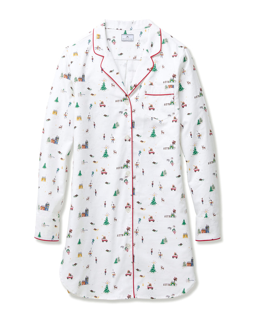 Petite Plume wishes you a “bonne nuit,” and in their luxury sleepwear, it’s hard not to oblige. The joyful sights of this peaceful holiday village will take you down memory lane. Santa winds his way through town, while vintage cars and wooden sleighs glide past pristine wintry decorations. This classic sleep shirt has a roomy fit but looks crisp thanks to details like the classic collar and elegant shirt-tail hem. The fabric is made from 100% of the finest quality cotton. It is yarn-dyed to prevent fade and brushed for added softness making the sleepwear feel absolutely luxurious, getting cozier after each wash.