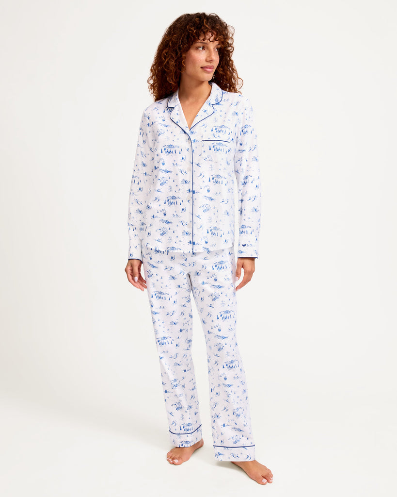 Petite Plume wishes you a “bonne nuit,” and in their luxury sleepwear, it’s hard not to oblige. The Women's Twill Pajama Set in Chalet Toile captures the magic of snowy getaways, with a ski-inspired print designed for those who adore winter adventures—or simply cozying up indoors. Classic tailoring, contrast piping, and logo buttons give this timeless set a crisp finish.