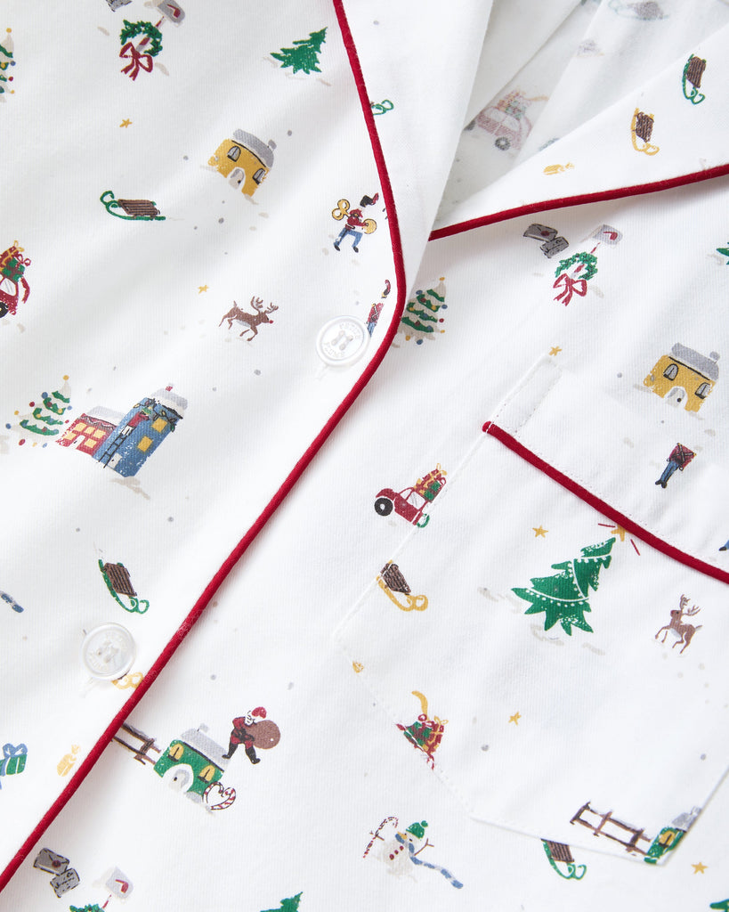 Petite Plume wishes you a “bonne nuit,” and in their luxury sleepwear, it’s hard not to oblige. With the Women’s Twill Pajama Set in Holiday Town, the joyful sights of this peaceful holiday village will take you down memory lane. Santa winds his way through town, while vintage cars and wooden sleighs glide past pristine wintry decorations.