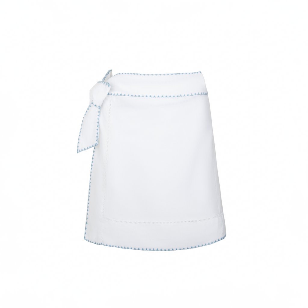 White embroidered finish. Lightweight, airy fabric. Short pareo silhouette. Adjustable tie waist.
